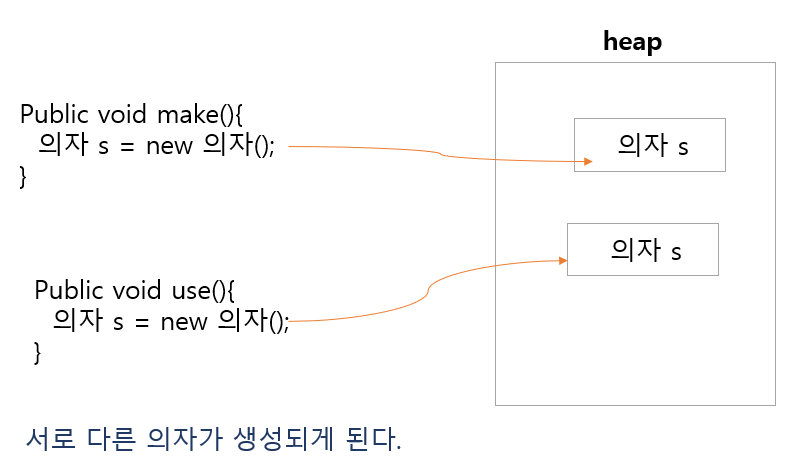 내가 오브젝트 의자를 new해서 heap이라는 메모리 공간에 올리게 되면 의자를 만든 메서드 내에서 관리하게 된다.